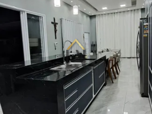 - Cozinha com ilha e mesa de jantar embutida, toda em pedra preto galático, pia e torneira gourmet, armários planejados